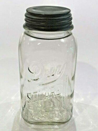Title (ebay affiliate link): ANTIQUE DREY SQUARE MASON QUART CANNING JAR & ZINC LID w/ BOYD''S MILK GLASS CAP
