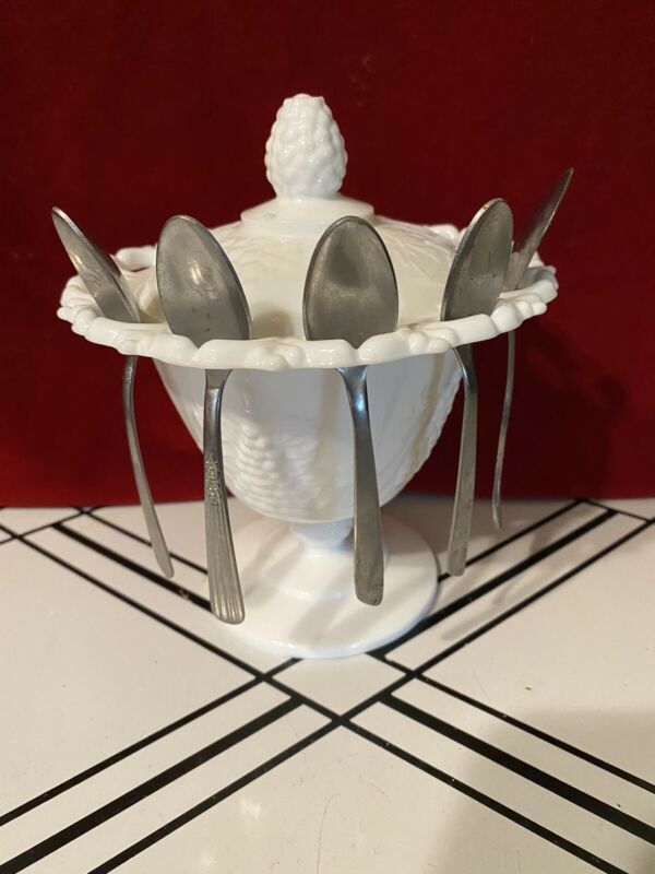 Title (ebay affiliate link): Vintage Milk Glass Candy Dish Spoon Holder with Lid Lattice Design Grapevine