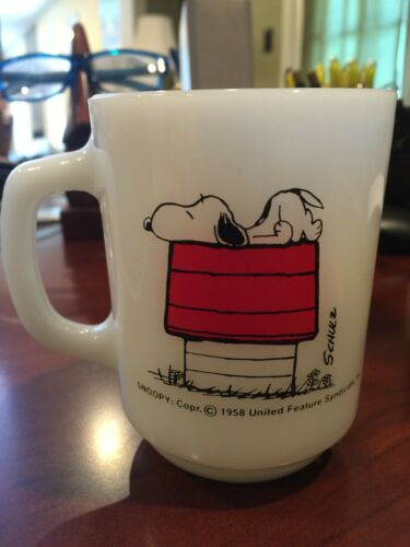 Title (ebay affiliate link): Vintage Peanuts Snoopy on Dog House Anchor Hocking Fireking Milk Glass Mug