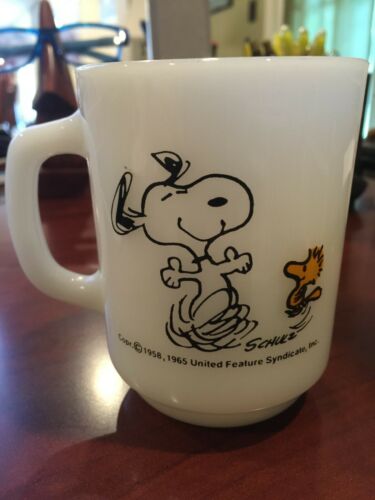 Title (ebay affiliate link): Vintage Peanuts Snoopy Life is Pure Joy Anchor Hocking Fireking Milk Glass Mug