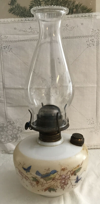 Title (ebay affiliate link): Vtg Wall Oil Lamp Milk Glass w Painted Bird & Rare Clear Glass Burner Cap Bell