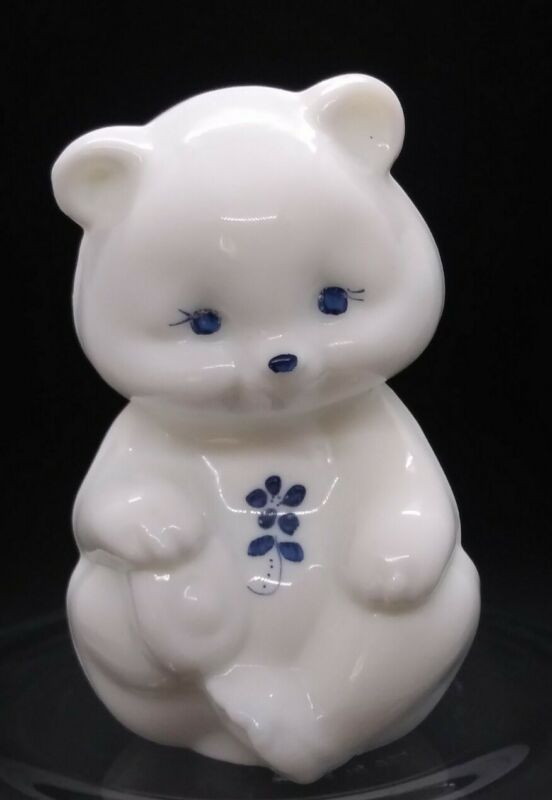 FENTON Bear White Milk Glass Glossy & Blue Floral Hand Painted Figurine