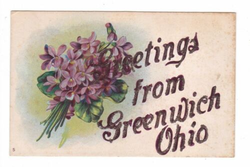 Title (ebay affiliate link): 1910 Purple Flowers Raised Design Emb. Glitter Greetings p c GREENWICH, Ohio