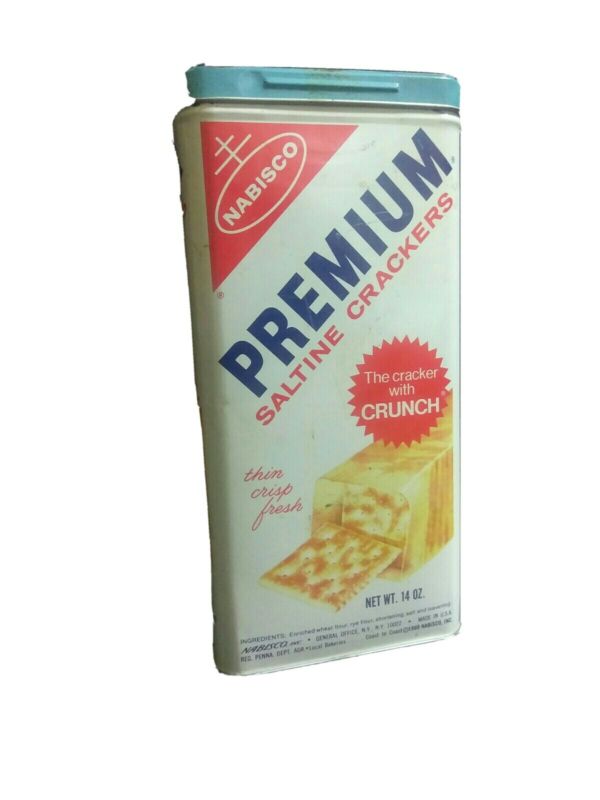 Title (ebay affiliate link): 1969 Nabisco Premium Saltine Crackers Vintage Tin Bight Colors - 9-1/2" Tall