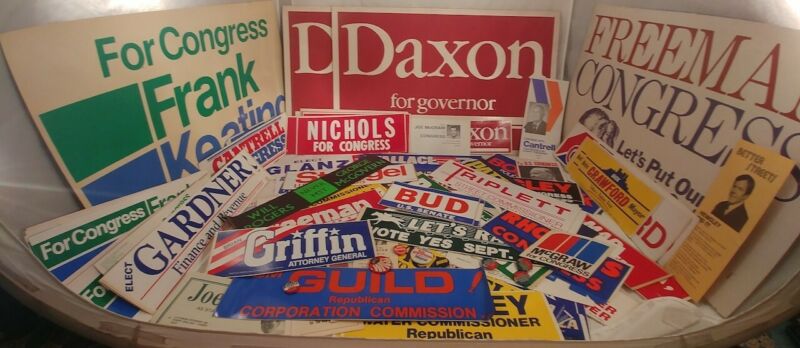 Title (ebay affiliate link): LARGE LOT OF VINTAGE OKLAHOMA POLITICAL MEMORABILIA INCL SIGNS STICKERS & MORE