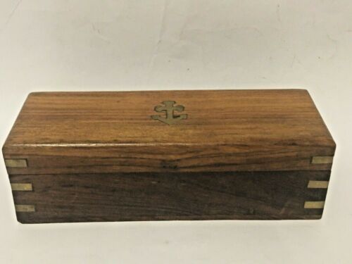 Vintage Wooden rectanguar box with hinged lid and anchor logo on top