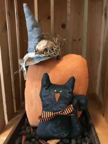 Title (ebay affiliate link): Primitive Halloween Black Cat Pumpkin Witch Hat Mouse Shelf Sitter Doll