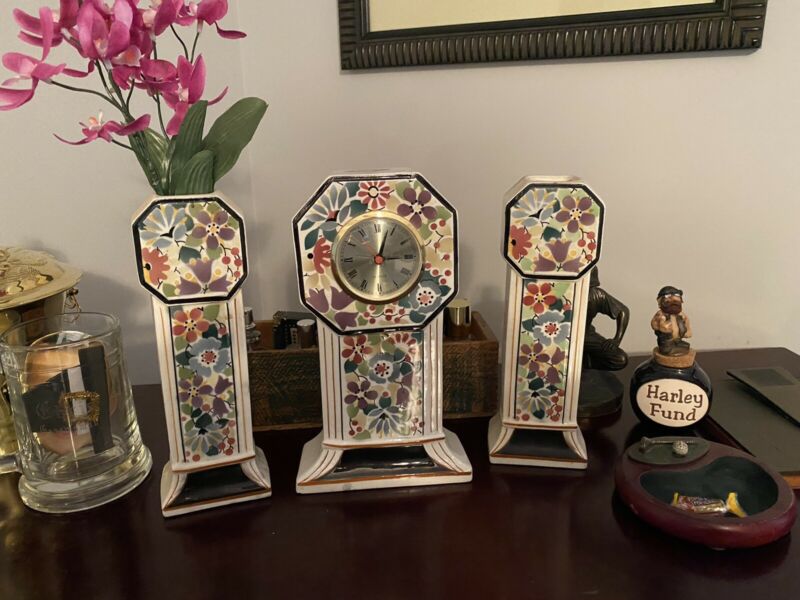 Title (ebay affiliate link): 3pc Early 1900s Beautiful PORCELAIN Quartz CLOCK + VASES Mantle Set