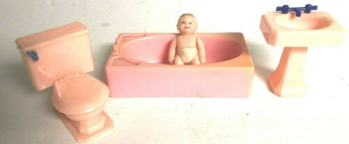 Title (ebay affiliate link): 1950''s RENWAL Pink Bathroom Furniture Doll House Dollhouse Baby Tub Sink Stool
