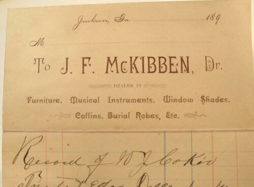 ANTIQUE 1895 JACKSON GA RECEIPT JF McKIBBEN DEALER FURNITURE COFFINS BURIAL ROBE