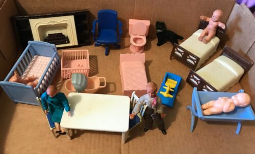 20 Piece Vintage Doll House Furniture, People,Cat,Beds,Buggy, Fireplace