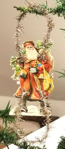 Title (ebay affiliate link): Red suited Santa Claus, with multitudes of Toys. German Tinsel & Paper Ornament
