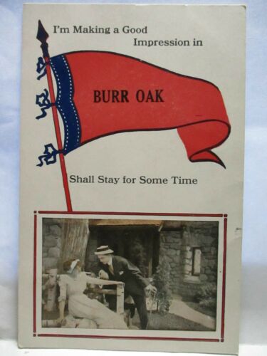 Title (ebay affiliate link): 1915 RISQUE PENNANT POSTCARD " MAKING A GOOD IMPRESSION IN BURR OAK " MI COUPLE