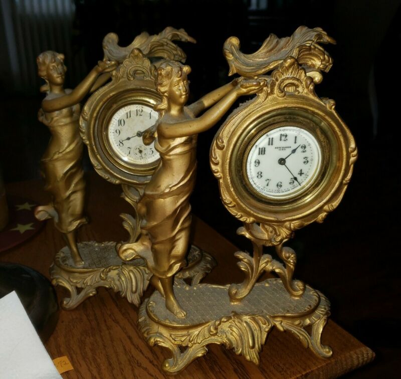 2 Antique 1800s Rococo Art Nouveau Victorian New Haven Gold Gilt 9.5" Clocks