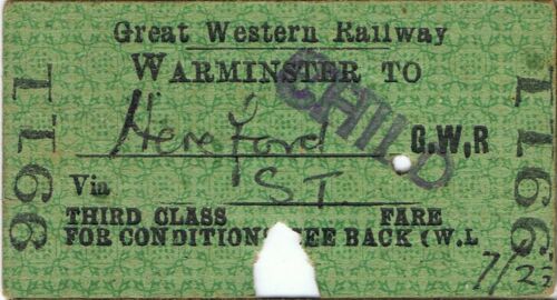 Title (ebay affiliate link): Railway ticket GWR Warminster to Hereford third class single 1943