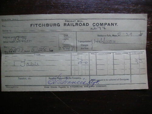 Title (ebay affiliate link): FITCHBURG RAILROAD SHELBURNE FALLS MA 1896 FREIGHT BILL LOT R-4