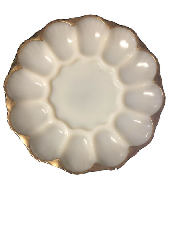 FIRE KING Egg Plate Anchor Hocking White Milk Glass Gold Trim
