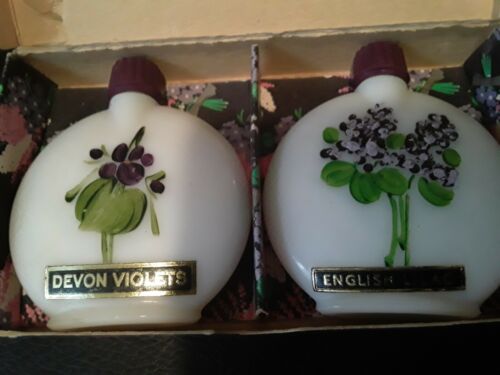 Title (ebay affiliate link): Vintage England Painted Milk Glass Perfume Bottles in Box Devon Violet Lilac