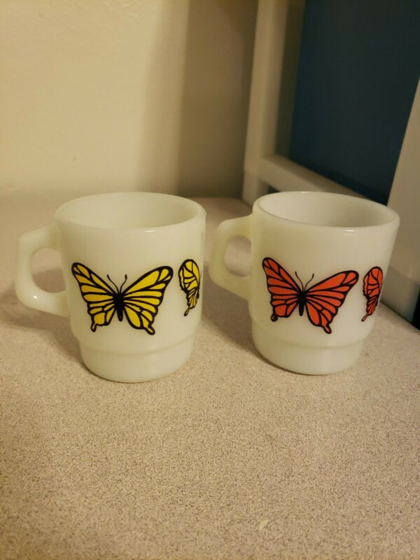 Title (ebay affiliate link): Vtg Anchor Hocking #312 Yellow & Orange Butterfly Milk Glass Coffee Mugs *Nice*