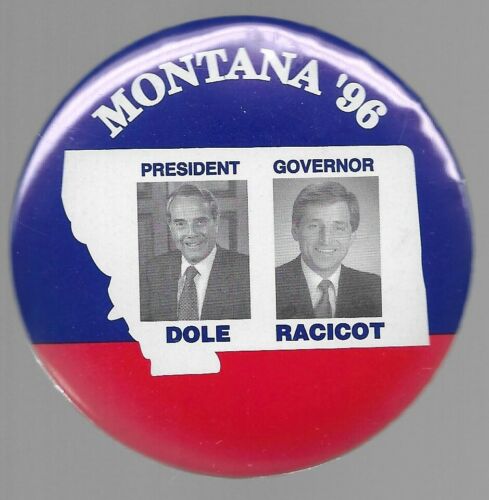 Title (ebay affiliate link): BOB DOLE, RACICOT FOR GOVERNOR MONTANA 1996 COATTAIL POLITICAL CAMPAIGN PIN