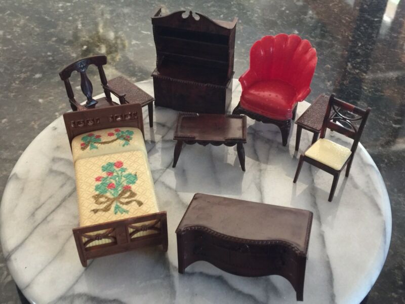 Title (ebay affiliate link): Misc VINTAGE DOLLHOUSE FURNITURE LOT . Rocking Chair, Chairs, Hutch, Tables, Bed