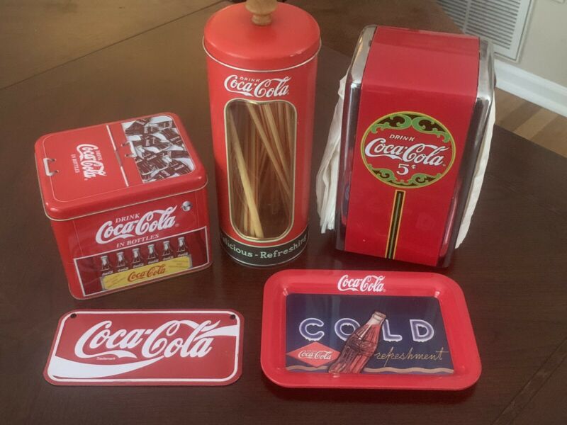 Coca Cola Lot Of 5! Straw/Napkin Dispenser/Tin/mini Tray/license Plate