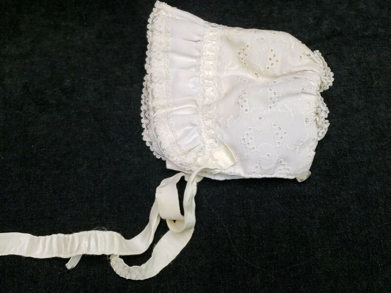 Vintage Antique DOLL Bonnet Cotton Eyelet Ribbon Fabric w Lace Trim 1950s Era