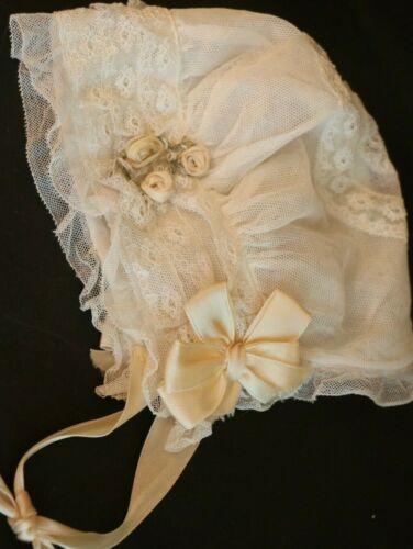 Title (ebay affiliate link): Vintage Doll Bonnet, Lace, Silk Netting and Ribbon Doll Bonnet, Antique Doll Hat