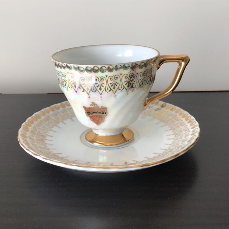 Title (ebay affiliate link): Westminster Fine China Pearl White Petite Tea Cup & Saucer Gold Trim #454