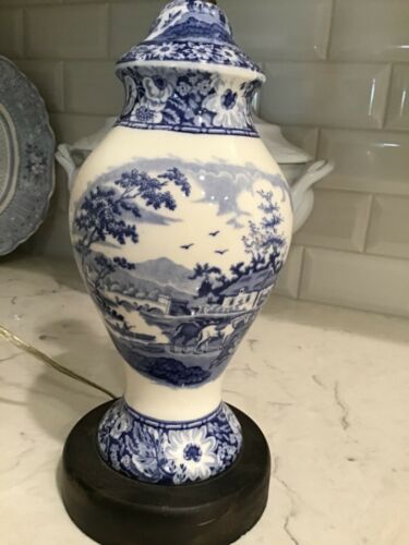 Title (ebay affiliate link): Antique Transferware Staffordshire Blue Lamp-Rural, Horses, Cottage,Lake