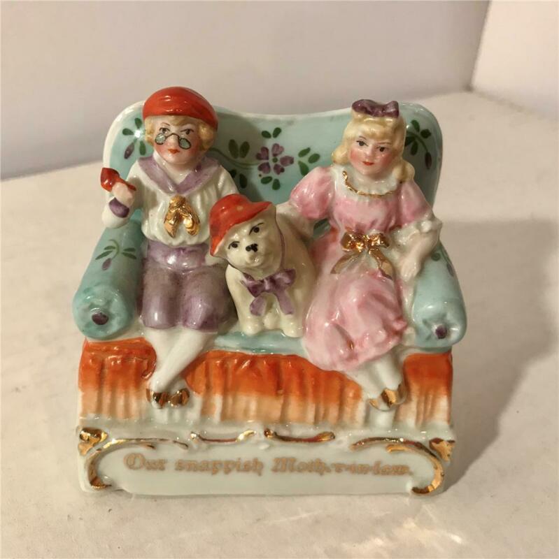 Title (ebay affiliate link): German Poreclian Fairing Children & Dog On Sofa Our Snappish Mother-In-Law 1890s
