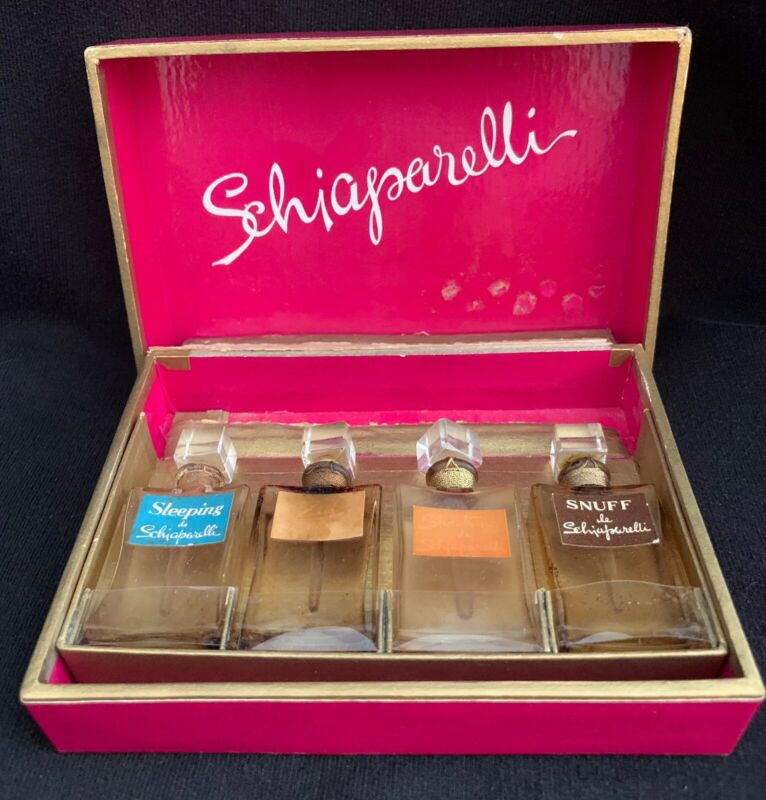 Title (ebay affiliate link): RARE ANTIQUE 1940s SCHIAPARELLI 4 PERFUME BOTTLES SET IN THE BOX 2 1/2 IN TALL