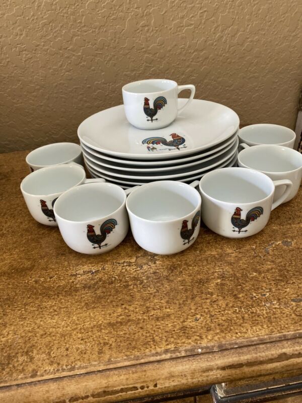 Vintage Berggren Rooster 8 Lunch Plates And 8 Cups Mint Condition.