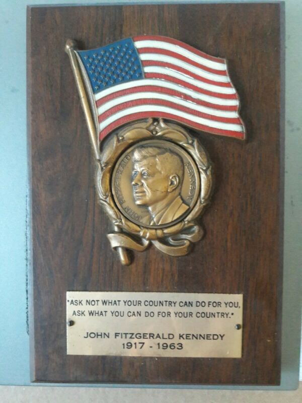 Title (ebay affiliate link): John Fitzgerald Kennedy With Flag And Medallion on wooden plaque.