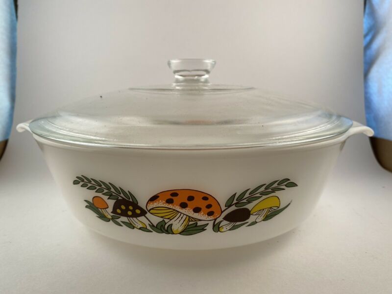 Title (ebay affiliate link): VINTAGE FIRE KING Milk Glass 2 QT Casserole Dish/Mushroom Design/ Beautiful!!
