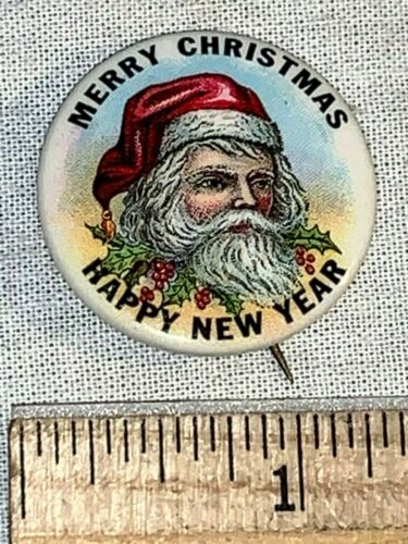 Title (ebay affiliate link): ANTIQUE CELLULOID PINBACK BUTTON MERRY CHRISTMAS HAPPY NEW YEAR SANTA CLAUS PIN