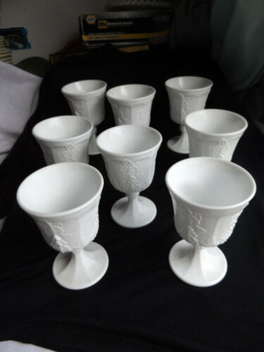Title (ebay affiliate link): Lot of 8 Vintage White Milk Glass Pedestal Goblets With Grape Pattern