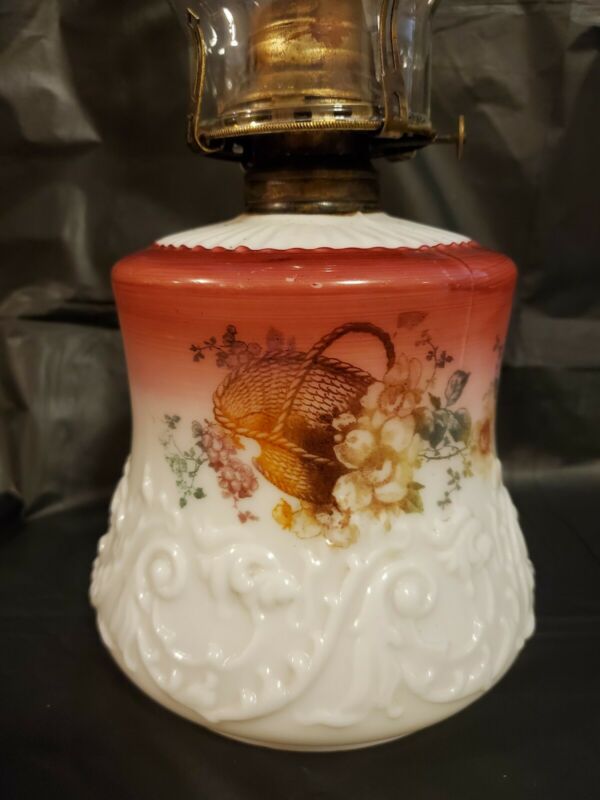 ANTIQUE Hand Painted Floral Design Milk Glass Oil Lamp