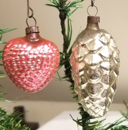 Title (ebay affiliate link): Miniature Pebbled Red Heart. Silver Pinecone. Two 1920s German Ornaments.