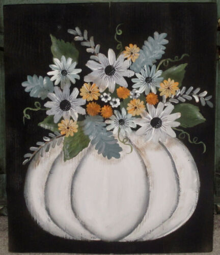 *~*PRIMITIVE*~* HP FOLK ART PRIM PUMPKIN * SUNFLOWERS * GREENS*~* RECLAIMED WOOD