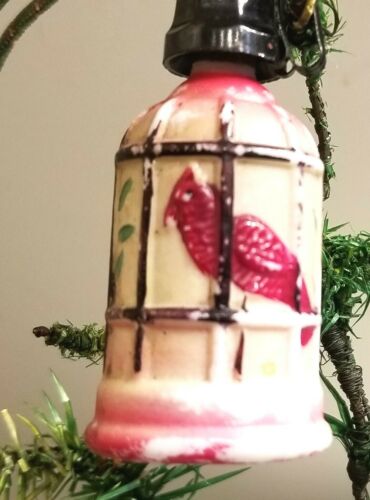 Title (ebay affiliate link): Red Parrot in Red Wire Cage. C-6 Miniature Base. Milk Glass, Japan. Works.