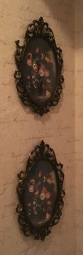 Pair of Vintage Convex Oval Glass Ornate Metal Frames Floral Print Made in Italy