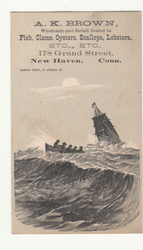 Title (ebay affiliate link): A K Brown Fish Clams Scallops Lobsters Oysters New Haven Waves Vict Card 1880s