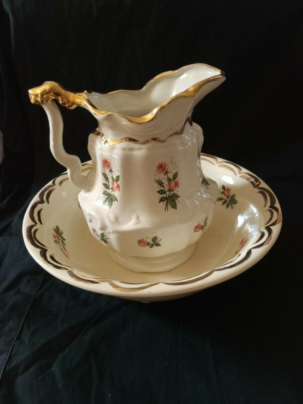 Beautiful Antique Vintage Floral with Gold Trim Pitcher and Wash Basin bowl Set
