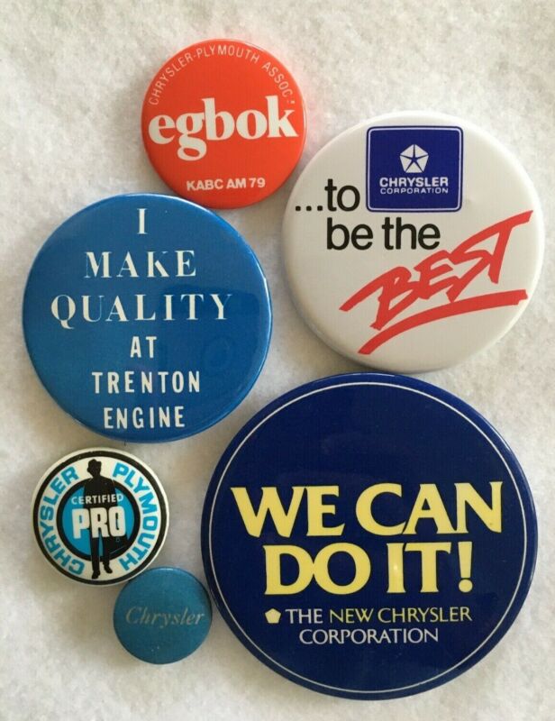 Title (ebay affiliate link): 6 Vintage Chrysler Pin-backs, "WE CAN DO IT!" "CHRYSLER PLYMOUTH CERTIFIED PRO"