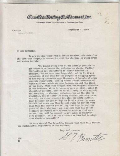 Title (ebay affiliate link): COCA-COLA BOTTLING CO. (THOMAS), INC.CHATTANOOGA, TENN. LETTERHEAD Dated 9/7/43