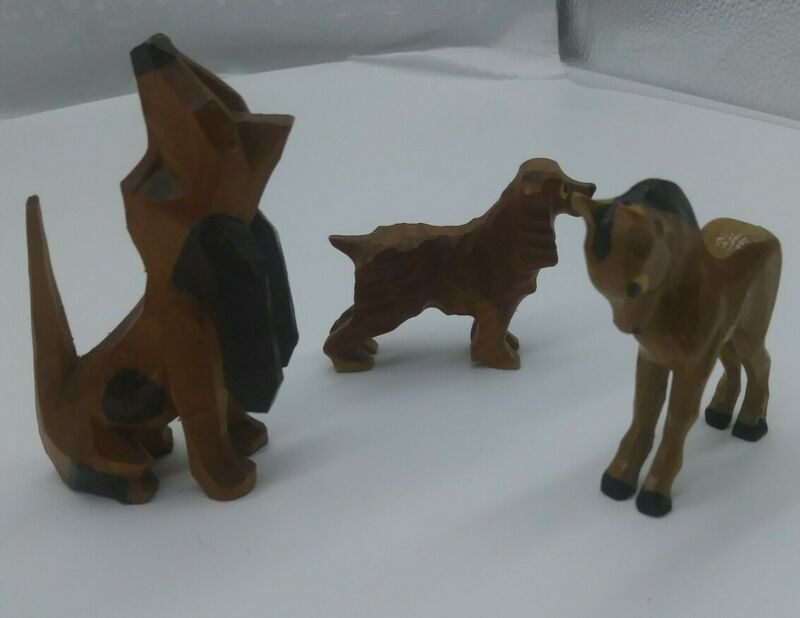 VINTAGE HAND CARVED WOODEN 2 DOGS and HORSE FIGURINE FOLK ART