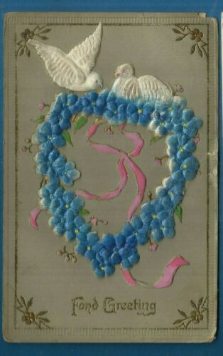 Greetings embossed, fuzzy postcard/ white doves/ blue flowers/gilded postcard