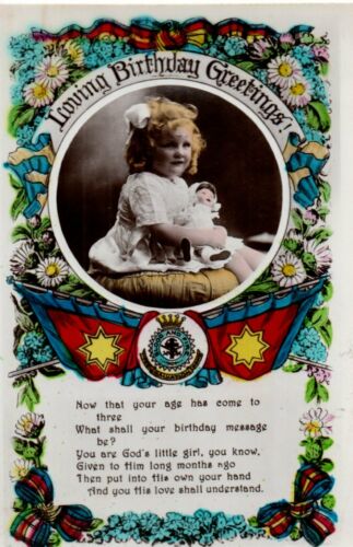 VINTAGE SALVATION ARMY BIRTHDAY GREETING postcard: LITTLE GIRL & DOLL FL;AGS