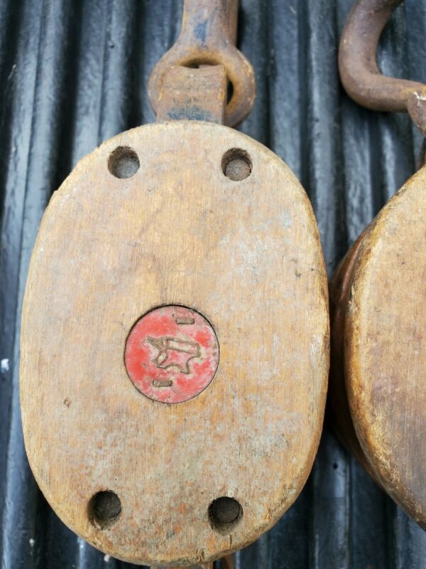 Title (ebay affiliate link): Vintage Iron And Wood Block And Tackle Double & Triple Double With Anvil Logo.